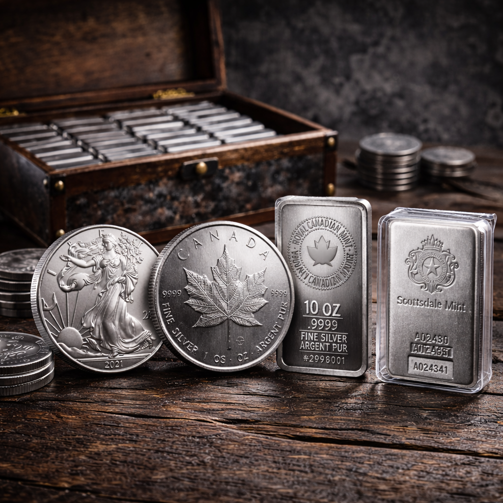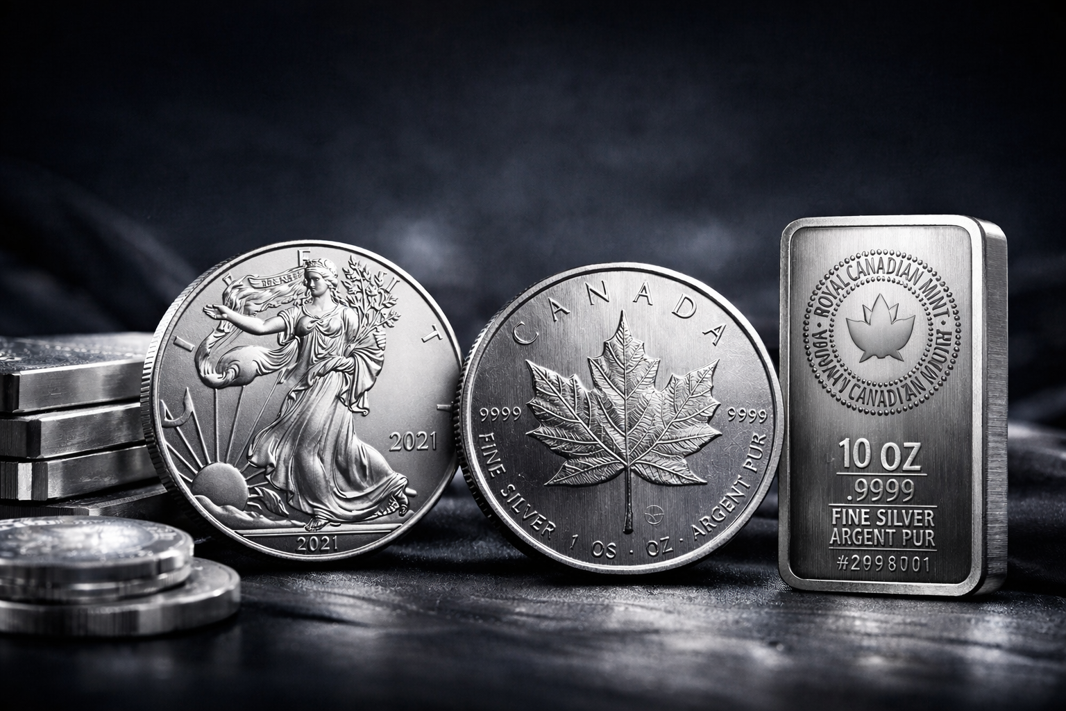 Discover a curated selection of genuine silver coins and bars from world-renowned mints.